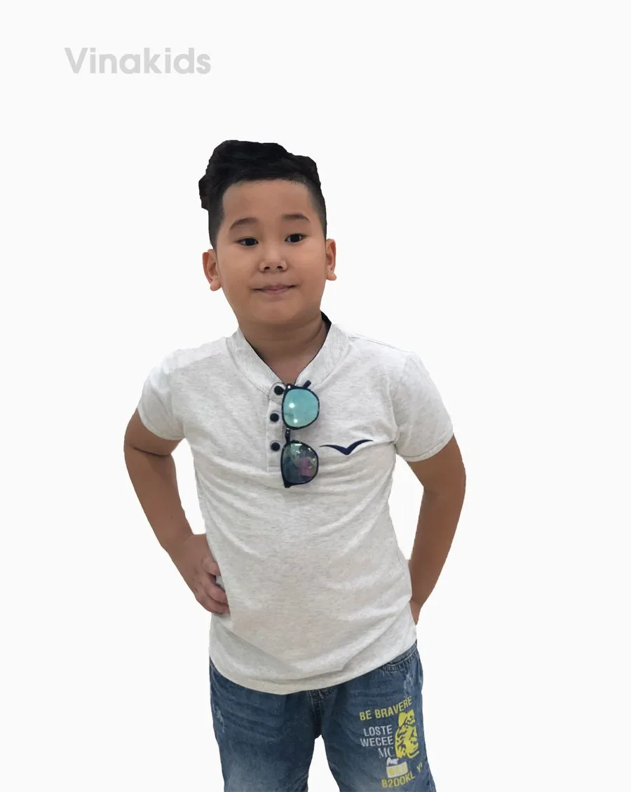 Vinakids logo embroidered mandarin collar shirt for boys, gray, for children from 6 to 12 years old – With modern, youthful design, plain pattern creates elegance when children wear the clothes.